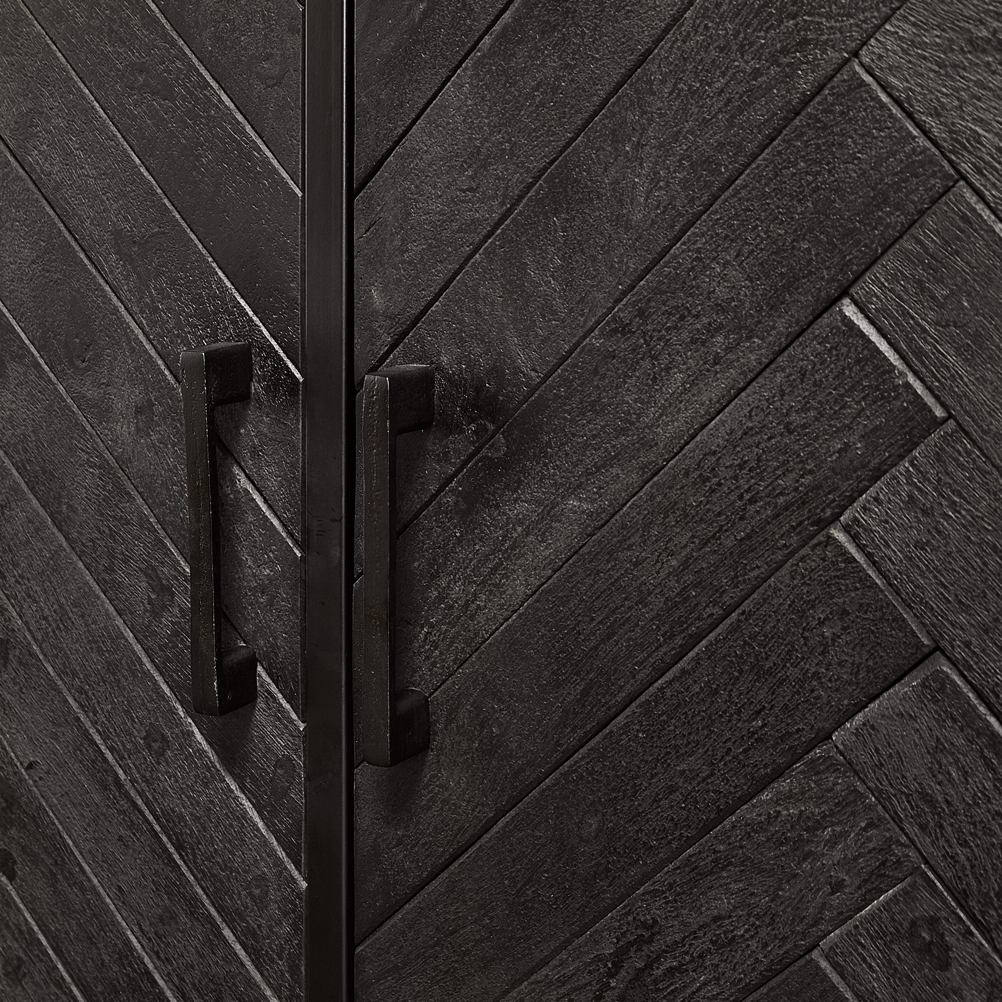Kabinet kast 'New York' is gemaakt van massief mangohout. De kabinet kast heeft twee deuren en vier lades. Achter de twee lange deuren vind je nog drie extra legplanken. Het massieve mangohout is gezandstraald en behandeld met een zwarte lak. Het hout is ingelegd in een visgraatpatroon. Het zwart metalen frame en de metalen handgrepen zijn afgewerkt met een zwarte lak.