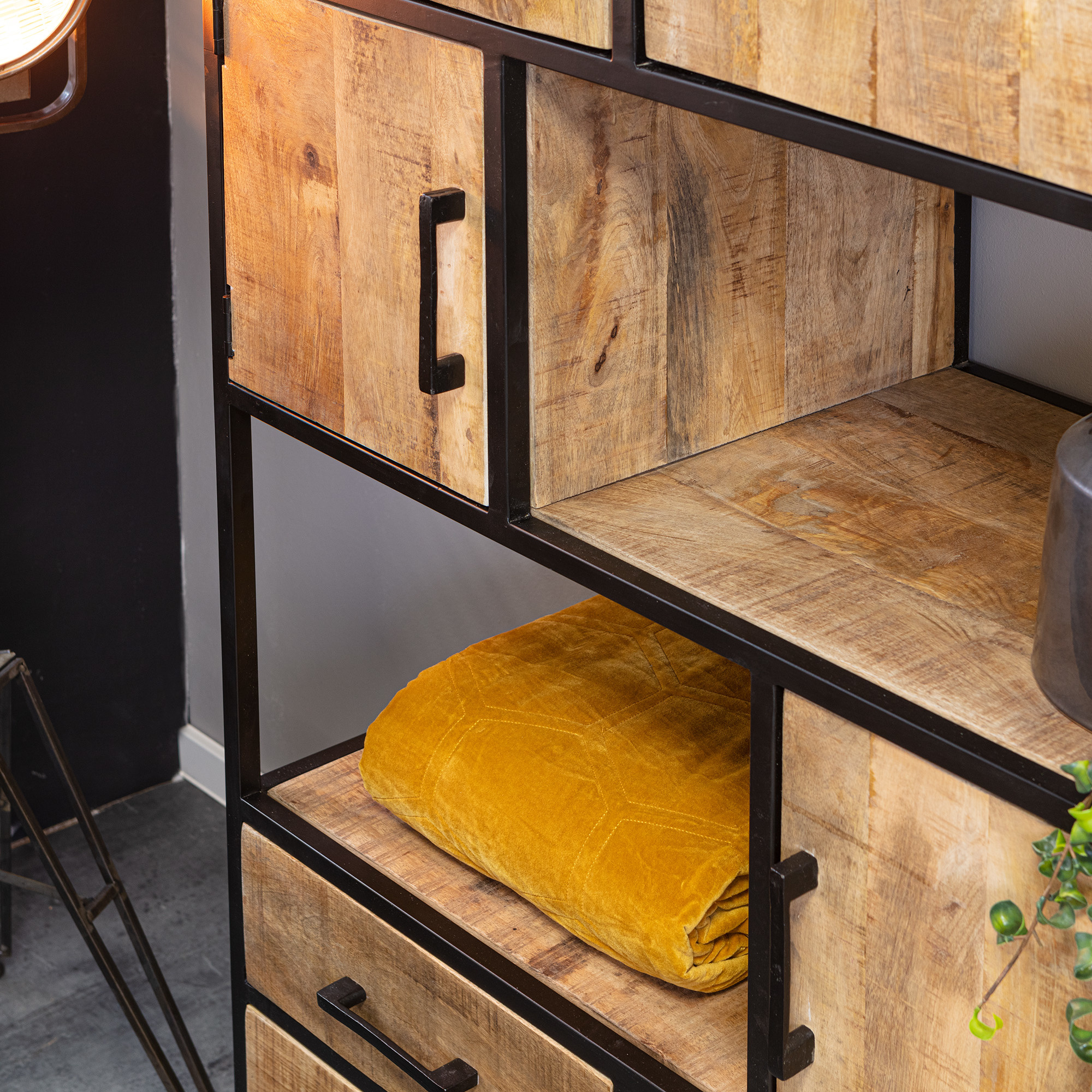 Deze industriele vakkenkast is een lust voor het oog. Deze stoere vakkenkast is gemaakt van gelakt mangohout en staal. Het mangohout is afgewerkt met een natuurlijke lak en het metalen frame is afgewerkt met een zwarte poedercoat.